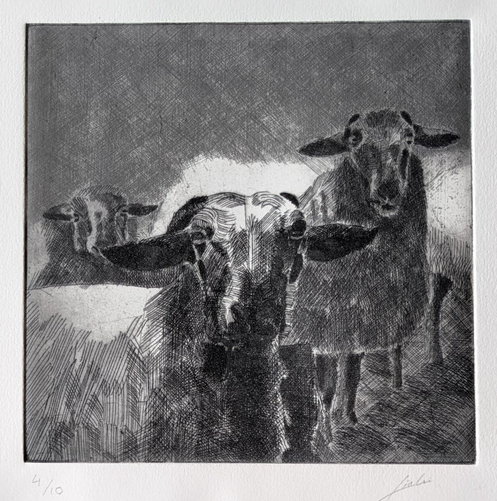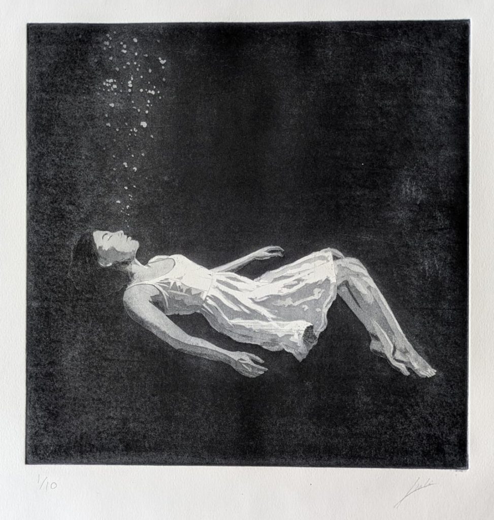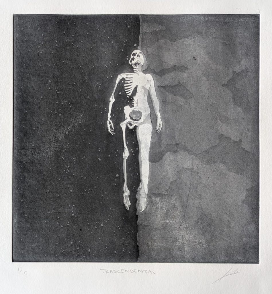 Cada obra aquí presentada ha sido realizada mediante técnicas tradicionales de grabado —aguafuerte, aguatinta o punta seca— sobre planchas metálicas trabajadas a mano.